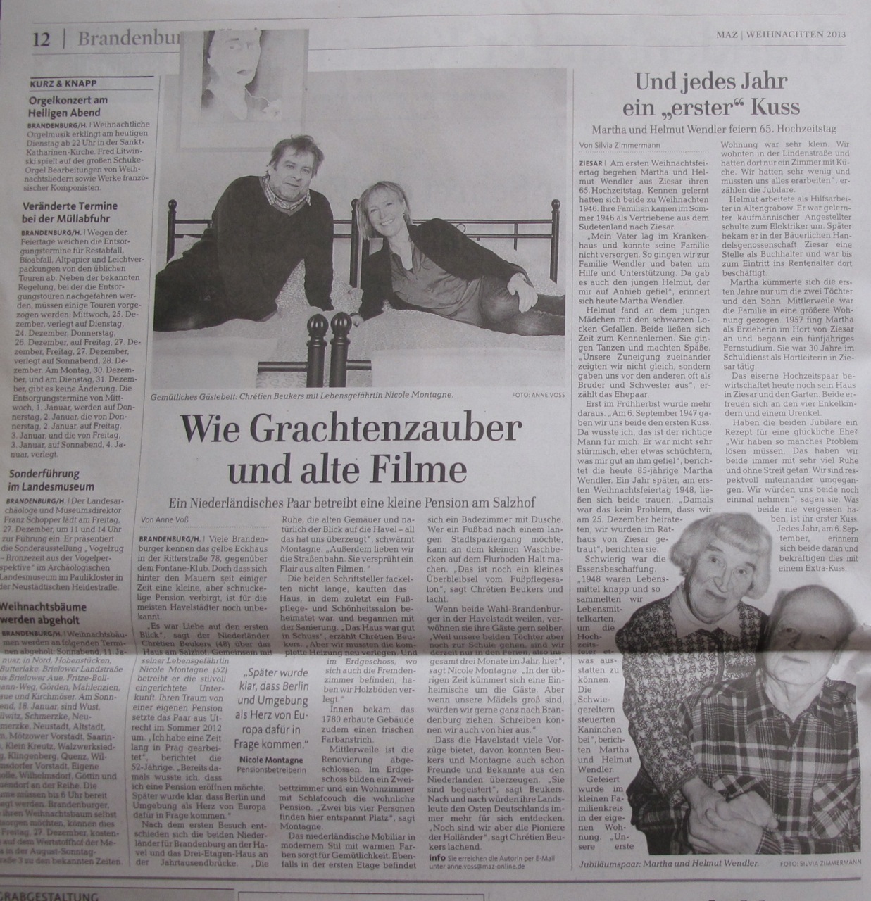 Das Haus am Salzhof staat vandaag in de Weihnachtsbeilage van de Märkische Allgemeine Zeitung (ook in Berlijn verkrijgbaar). Natuurlijk is de Salzhofredactie hier buitengewoon blij mee! ‘Ein Niederländisches Paar betreibt eine kleine Pension am Salzhof’ is de ondertitel. En: ‘Viele Brandenburger kennen das gelbe Eckhaus in der Ritterstrasse 78, gegenüber dem Fontane-Klub. Doch dass sich hinter den Mauern seit einiger Zeit eine kleine, aber schnuckelige Pension verbirgt, ist für die meisten Havelstädter noch unbekannt.’ En: ‘Die beiden Schriftsteller fackelten nicht lange, kauften das Haus, in dem zuletzt ein Fusspflege- und Schönheitssalon beheimatet war, und begannen mit der Sanierung.’ Maar ook: ‘Stilvoll eingerichtete Unterkunft.’ En ‘Das die Havelstadt viele Vorzüge bietet, davon konnten Breukers und Montagne auch schon Freunde und Bekannte aus den Niederlanden überzeugen.’ En nog veel meer.